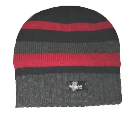 Gebreide muts in gestreept motief in de kleuren helder rood, grijs en zwart met een breed gebreide onderrand. Deze muts is gevoerd met een zwarte fleece binnenvoering.